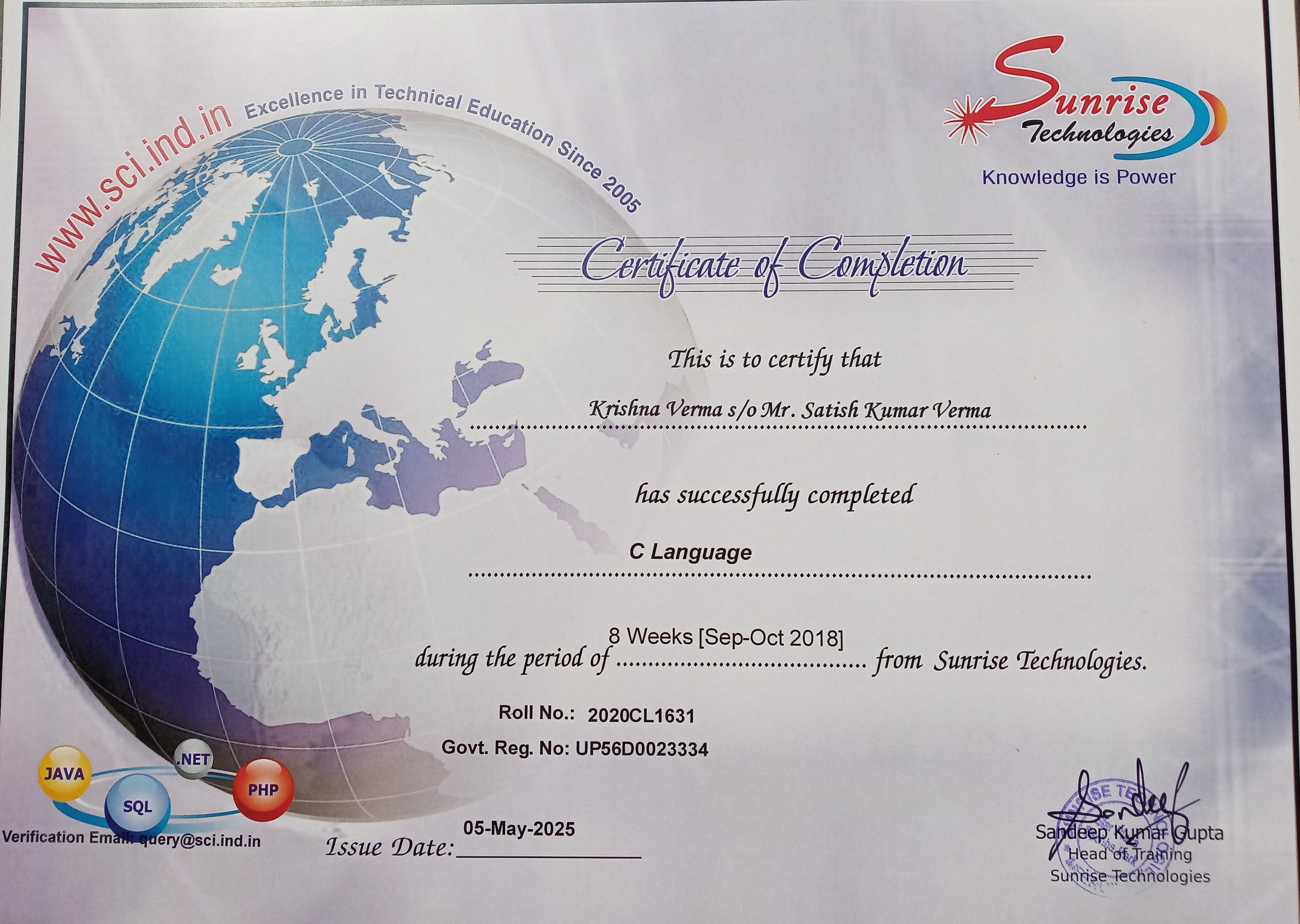 Krishna Verma | Address : Dayampur, Kanker Khera, Meerut Cantt (250001), UP | Contact : 9520335394 , 7500045310 | Email Id : krishnaverma28081997@gmail.com | Website : krishnaportfolio.in | Technologies: C, C++, Java, HTML, CSS, Javascript, SQL, PHP, Python, TypeScript, Bootstrap, W3.CSS, Jquery, Node JS, Express JS, NumPy, Pandas, Wordpress, Codeigniter, Laravel, Angular, VueJS, Tailwind CSS, MySQL, MongoDB, AJAX, JSON, OOPS, Git & GitHub, AI Tools |