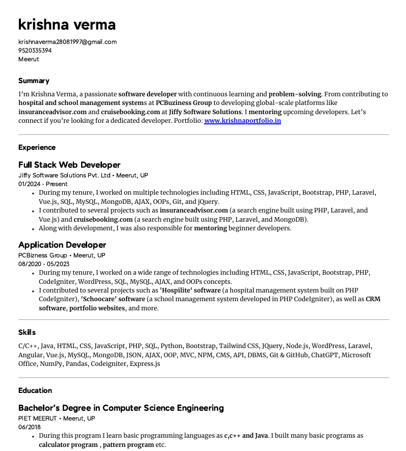 Krishna Verma | Address : Dayampur, Kanker Khera, Meerut Cantt (250001), UP | Contact : 9520335394 , 7500045310 | Email Id : krishnaverma28081997@gmail.com | Website : krishnaportfolio.in | Technologies: C, C++, Java, HTML, CSS, Javascript, SQL, PHP, Python, TypeScript, Bootstrap, W3.CSS, Jquery, Node JS, Express JS, NumPy, Pandas, Wordpress, Codeigniter, Laravel, Angular, VueJS, Tailwind CSS, MySQL, MongoDB, AJAX, JSON, OOPS, Git & GitHub, AI Tools |